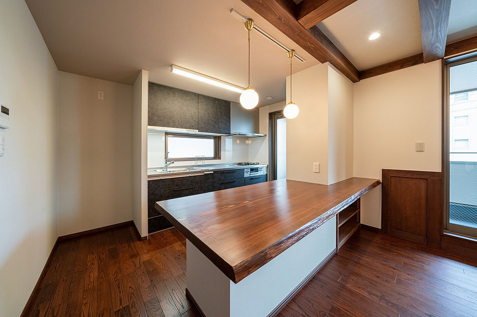 重圧感のある木を使用したカウンターで、食事の時間を楽しめます。